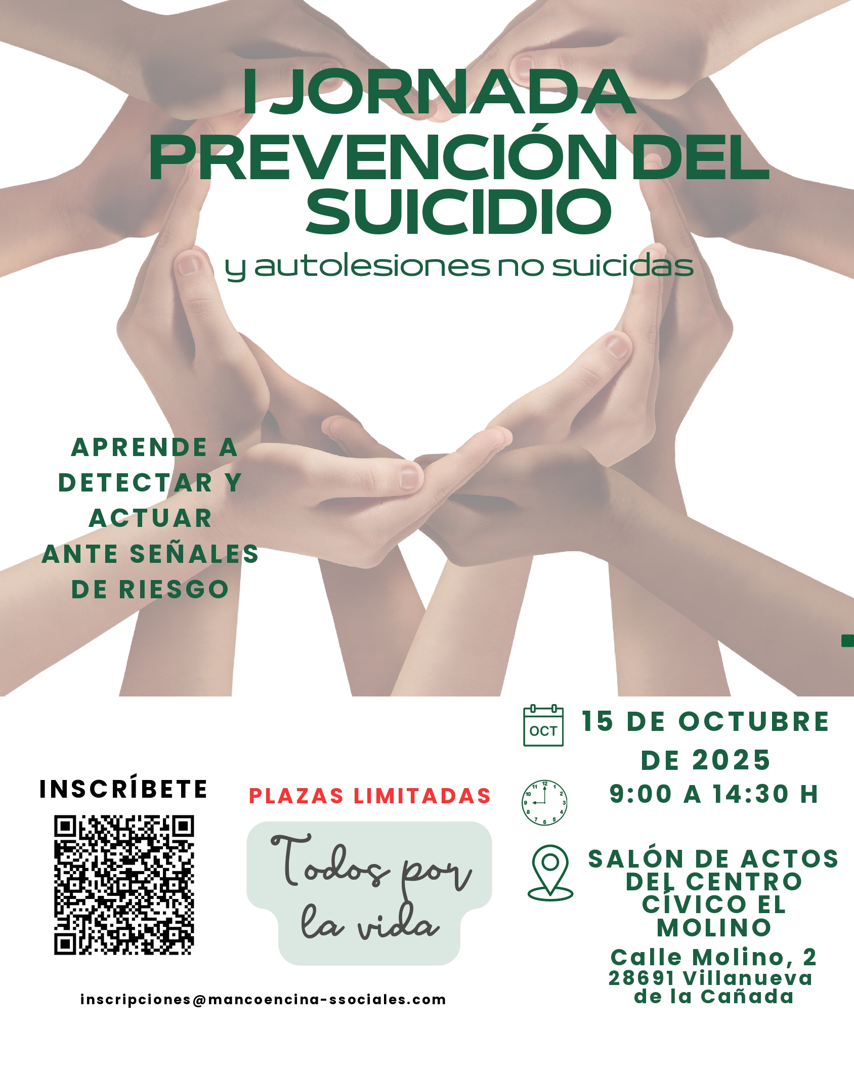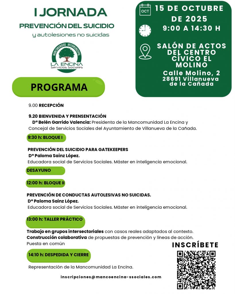 La Mancomunidad de Servicios Sociales La Encina celebrará el próximo 15 de octubre de 2025, de 9:00 a 14:30 horas, la I Jornada de Prevención del Suicidio y Conductas Autolesivas bajo el lema “Todos por la vida”. El encuentro tendrá lugar en el Salón de Actos del Centro Cívico El Molino (c/ Molino, 2, Villanueva de la Cañada).
